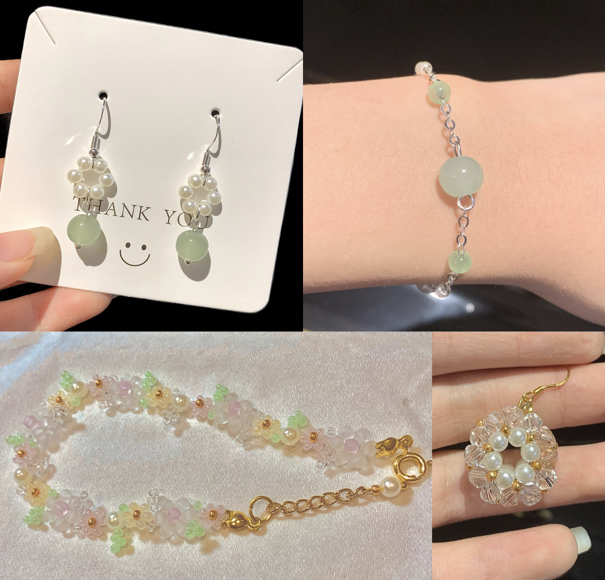These small beaded bracelets and earrings are crafted mainly from glass beads, and arranged in multiple designs. The earrings hooks we use are sterling silver and hypoallergenic. They have a simple hook design, making them easy to wear and versatile for any occasion. The bracelets are mostly soft pastel tones and are finished with a clasp and an adjustable chain, making them versatile. It has a slight elasticity to it and the clear elastic cords will not break easily. The bracelet is light and perfect for adding a touch of floral charm to any outfit.